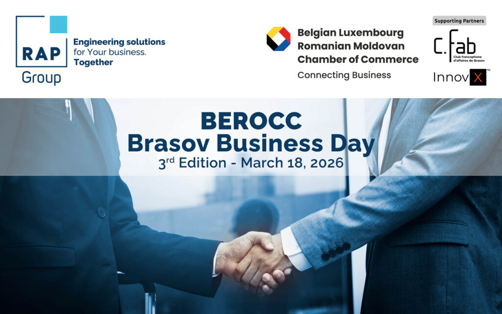 The event is organized by the Belgian Luxembourg Romanian Moldovan Chamber of Commerce (BEROCC) in partnership with CFAB – Clubul Francofon de Afaceri Brașov and Innovix, with RAP Group supporting the organization and hosting part of the program.